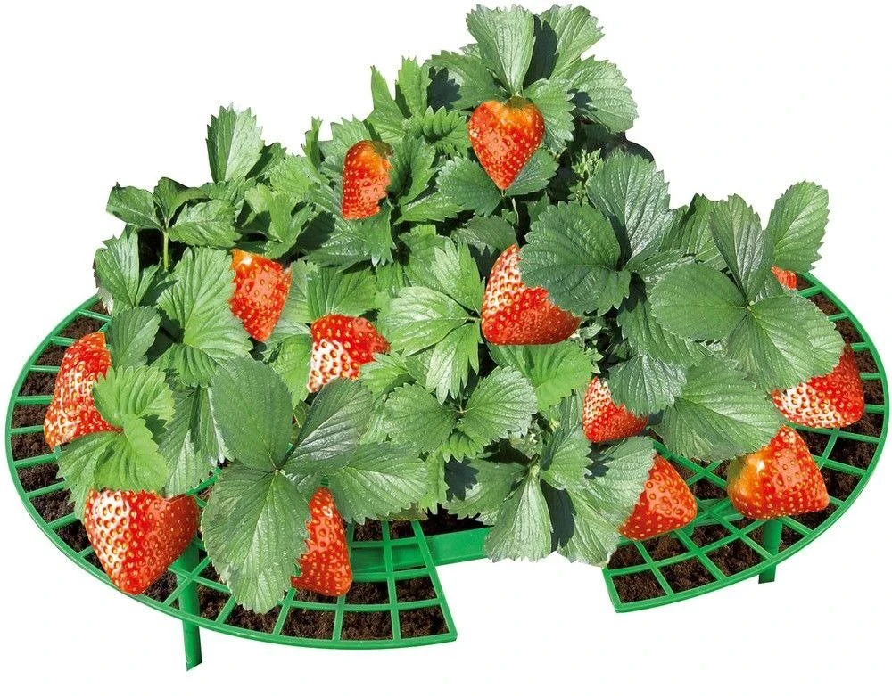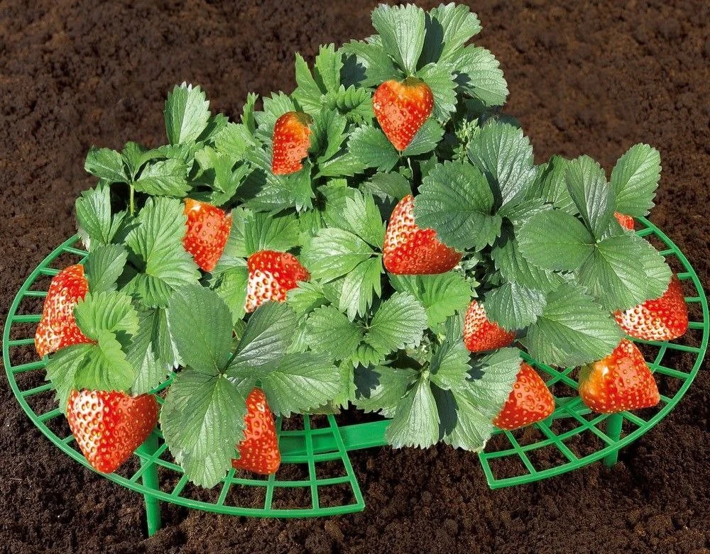 Produkt-Support ist wirklich einfach! Das Loch in der Mitte kann verstellt werden nur leicht erweitert, um es sanft und vorsichtig auf die Wurzel des Erdbeerbuschels zu legen. Die Blätter und Zweige selbst werden sich auf der Oberfläche des Gitters ausbreiten. Um die Höhe perfekt anzupassen, reichen die Beine des Ständers aus, um in den Boden zu fahren.